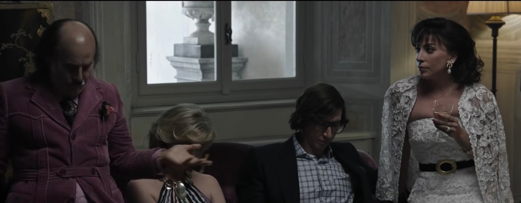 A movie about the Guccis could be told in many ways. The morbid story is based on real events. The movie could be a neo noir as the story has all the elements, the femme fatal, the patsy,seduction, murder and the perfect end for a noir movie. It could have been a drama film with a serious tone, especially because the cast included superb character actors . It could have been made like a show or an opera, with songs aria, tenors a la Sweeney Todd. After all, it is a story about an Italian family and has all the sound fury and drama needed for operatic effect.