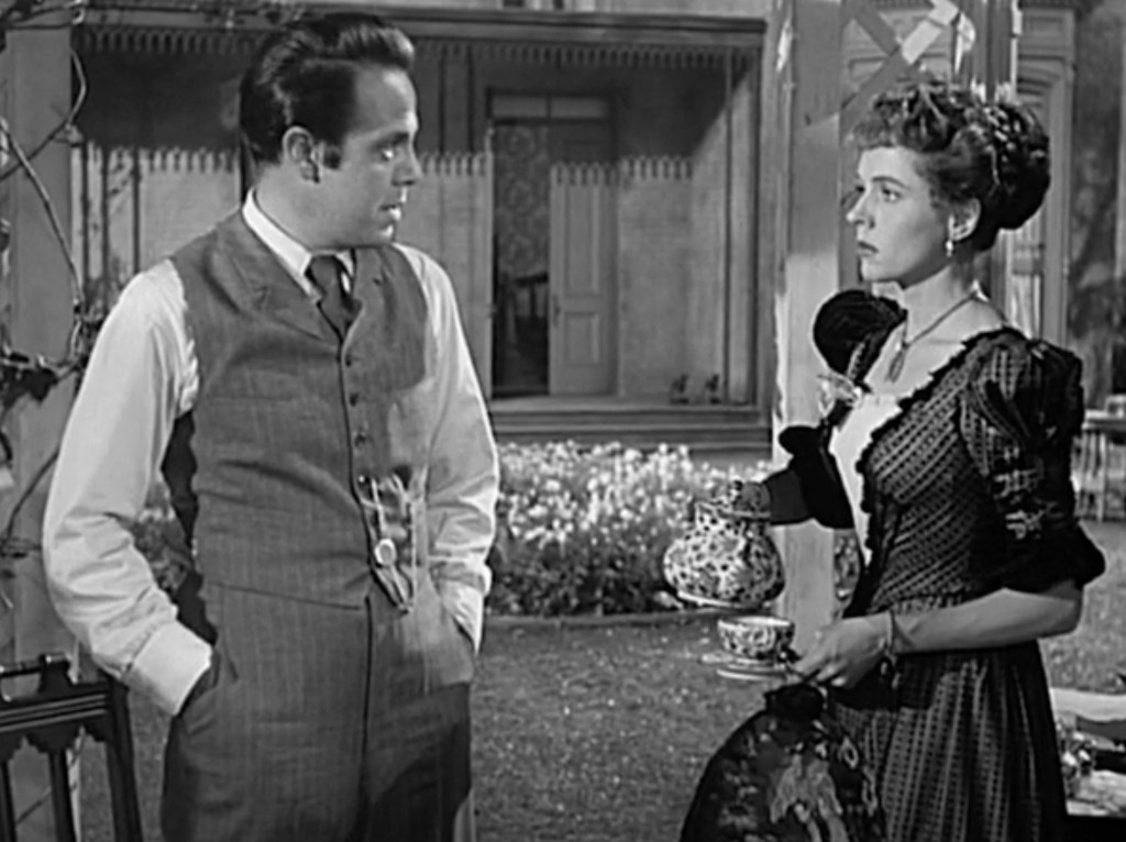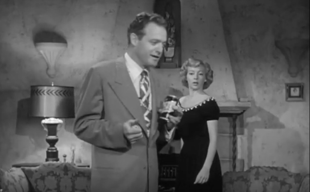 This scene is from the movie, Prowler. Here Van Heflin plays an evil cop. In this scene he is off-duty and visiting the home of a married woman, in the hopes of seducing her. He is certainly dressed for the occasion.
