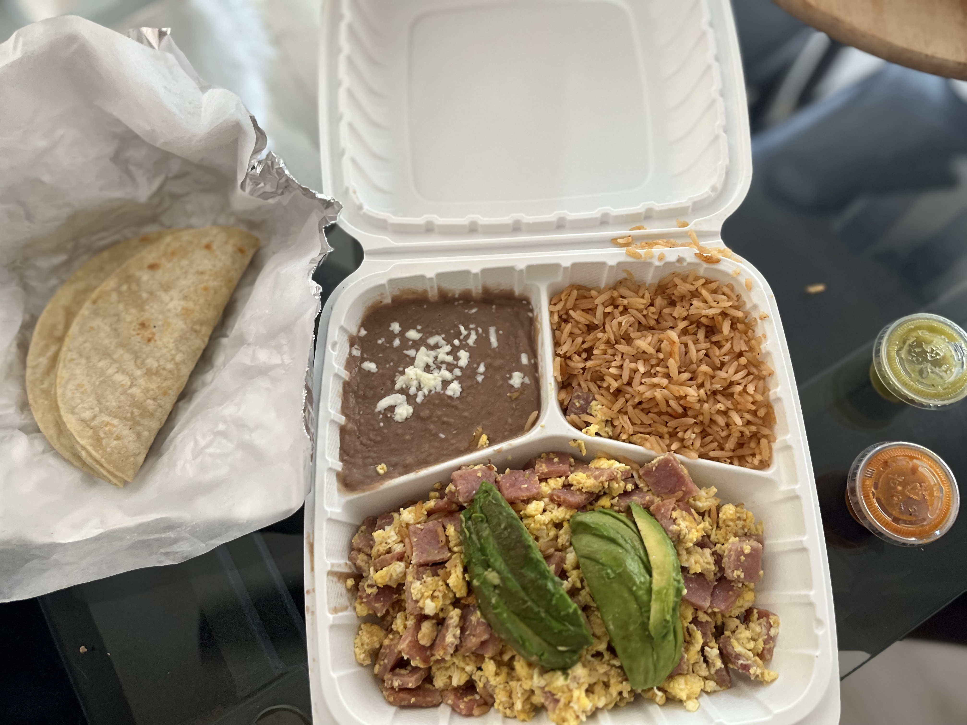 Typically, I pick the chicken burrito bowl or the ham and eggs plate (Huevos con Jamón). I usually order the latter for breakfast. (I’m still learning to pronounce the Spanish name.) It is served with rice, lentils, and senoritas (I choose the corn tortillas). The quantities served are generous.