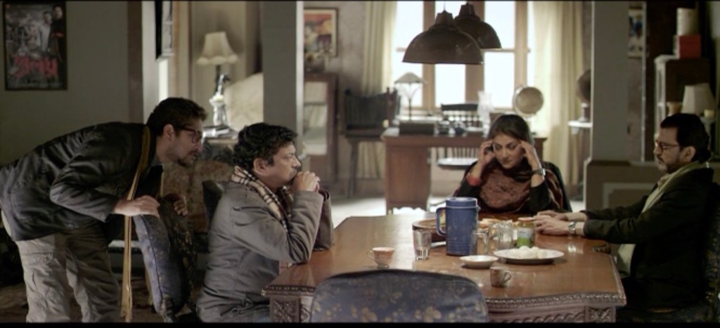 We are now thrown into the present “Universe” where a young aspiring filmmaker, Joy (Parambrata Chatterjee), is trying to convince three other middle-aged directors, two male and one female, to work with him on a movie with four short films. Joy knows a producer who can help them make the movie. One of the middle-aged male directors, Dipto (Chrianjeet Chakroborthy), has had a romantic relationship with the female director, Trina (Aparna Sen), that has not ended amicably, so much so that Trina nurses a dislike for him and refuses to work with him again. The other middle-aged director, Sankyo (Goutam Ghose), has had a very close friendship with the two former lovers. Trina now has a jealous older husband who suspects that she still nurses feelings for her former lover. Dipto, on the other hand, has a younger mistress and a grown-up son.