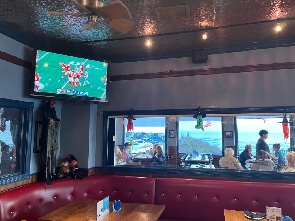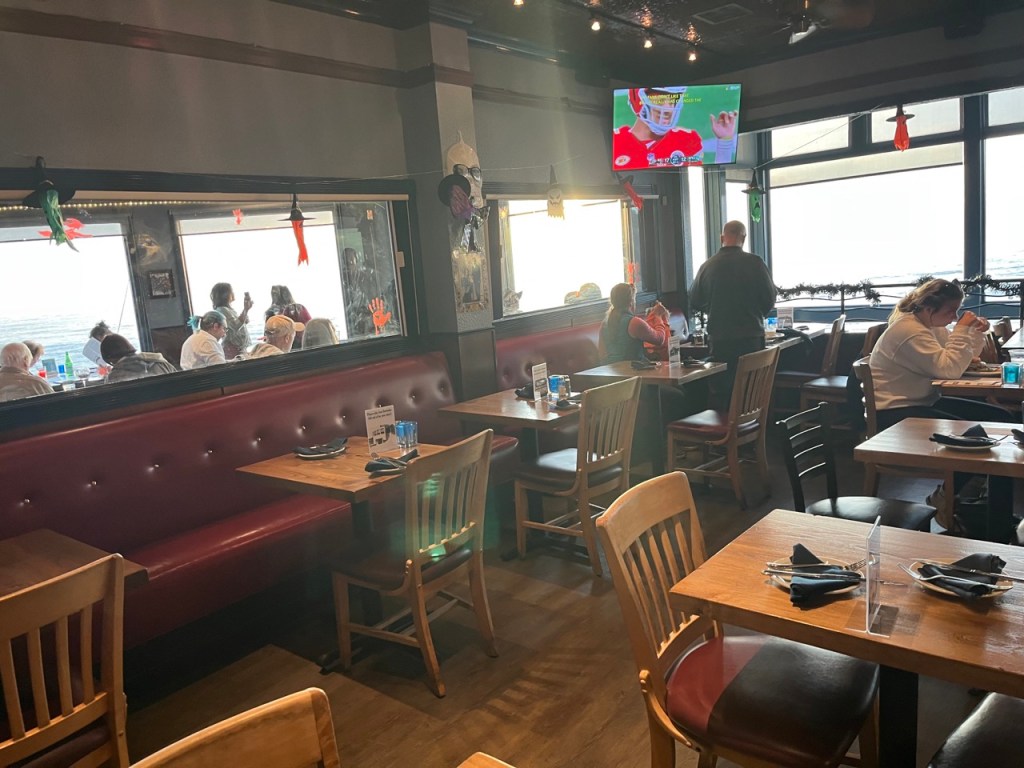 In addition to its scenic views of the Pacific, well-designed interior, and hospitable staff, the restaurant offers excellent seafood and other options. There are a number of seating options, with the indoor bar and table dining options on the floor, both great spots to watch the game on overhead TVs or simply savor great cocktails. Giant windows on all sides offer breathtaking views of the ocean.