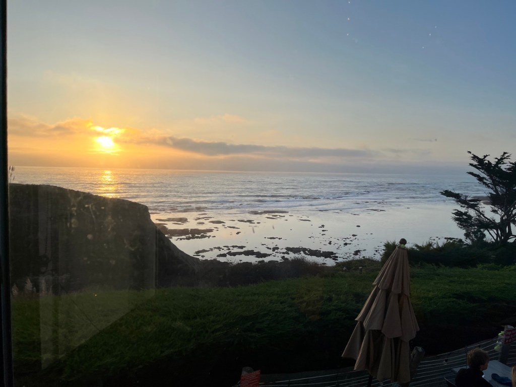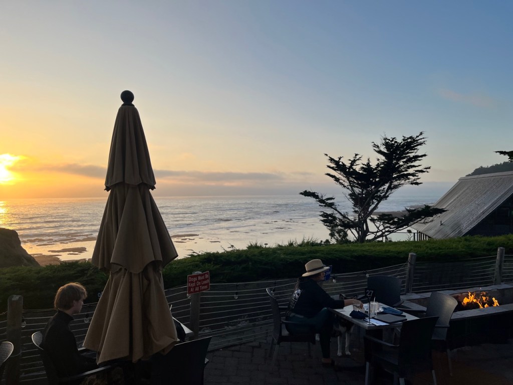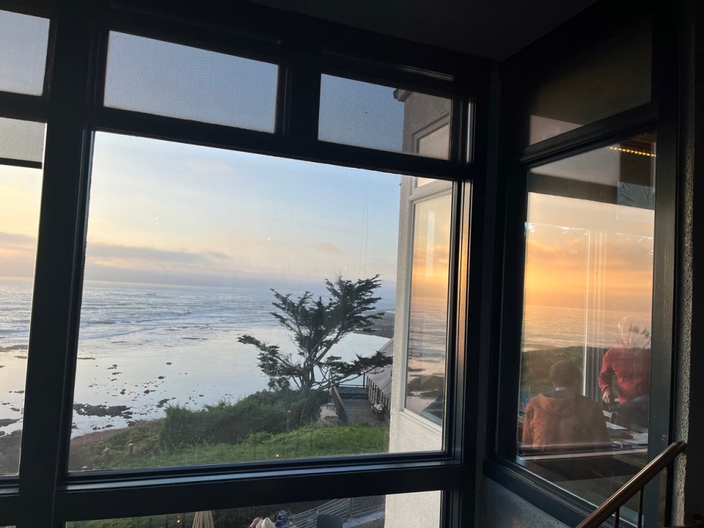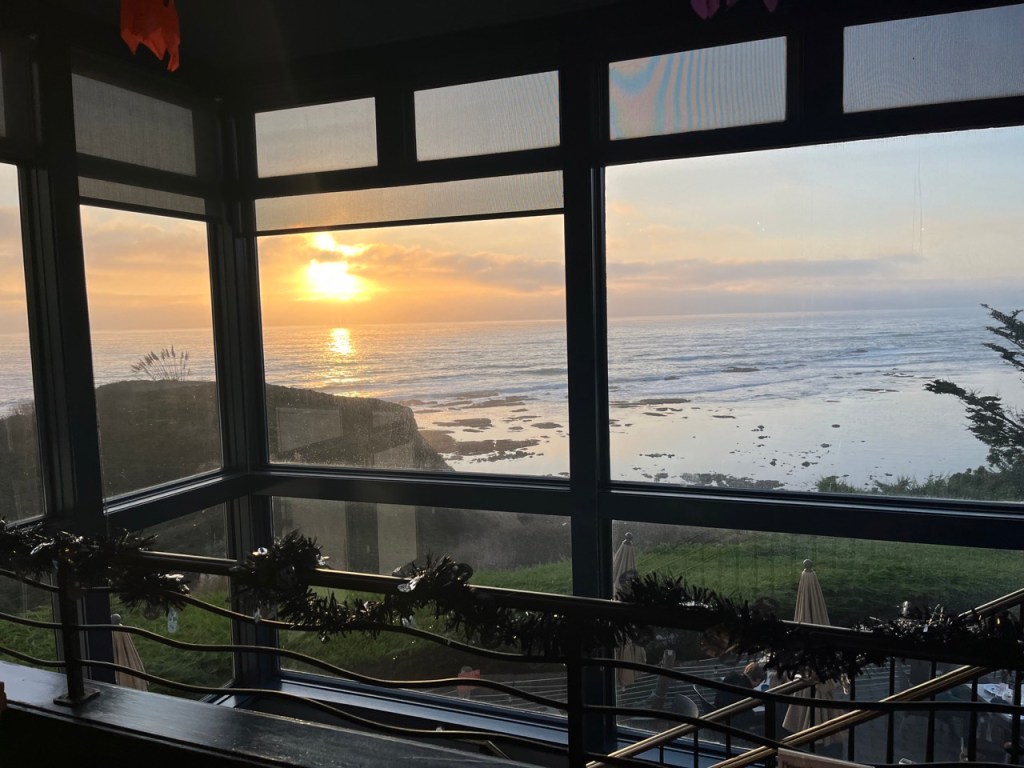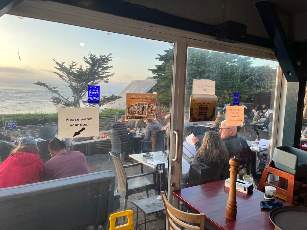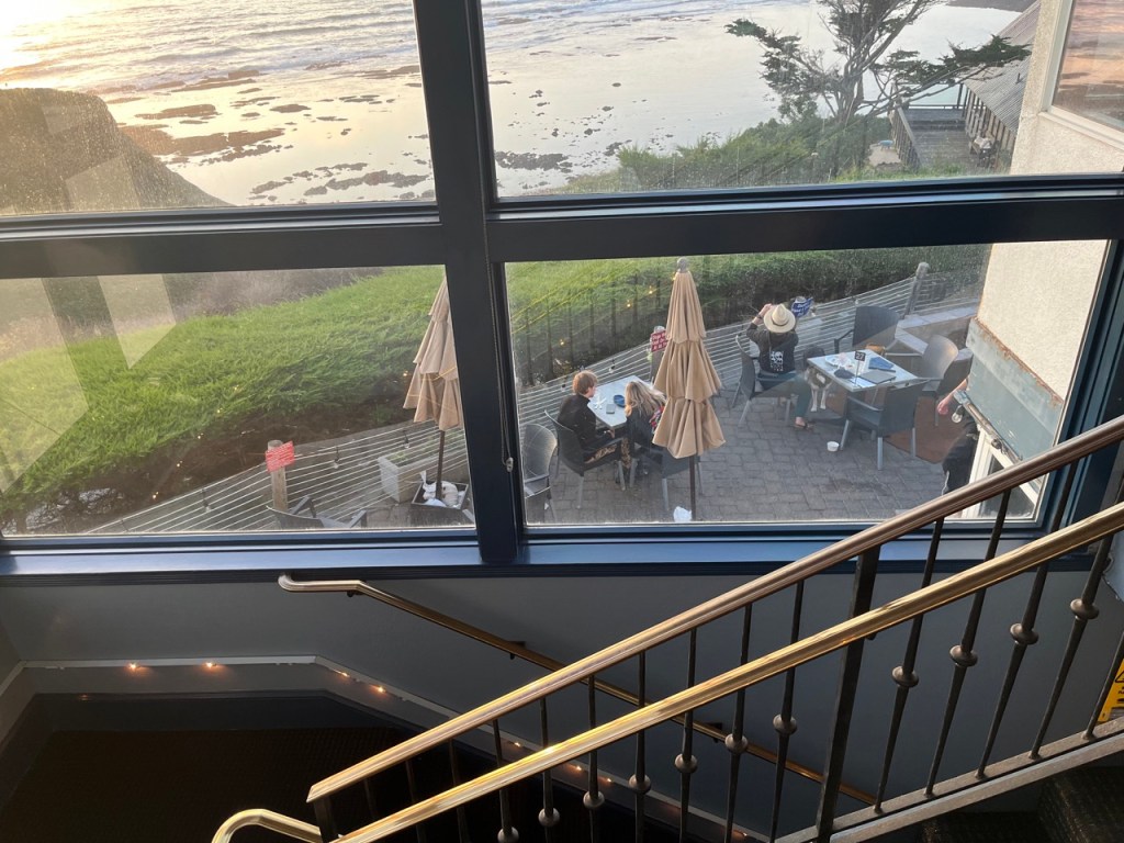 A stairwell, also surrounded with French windows offering more beautiful views, descends to additional indoor seating below, with still more views of the ocean. A glass door leads to the outdoor seating, where one can enjoy a fine meal by the fire and gaze at the magnificent ocean. On a prior visit, during daytime on a summer day, we could hear whistles and pulse calls from whales and also see their spouts appear like fountains at a distance in the ocean. It was a joy to behold.