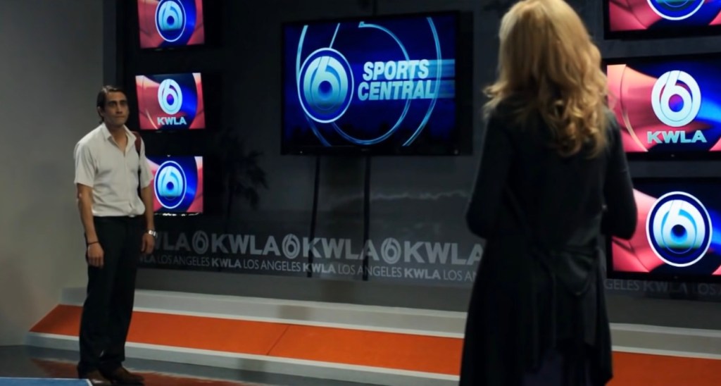 Over time, with increased practice, Lou’s work gets progressively better, and he continues to sell his captured footage to Nina’s station. Nina is insecure in her job and begins to rely more and more on Lou’s footage to stay competitive with other channels. Lou blackmails her that he will go to another station and makes it clear that he wants more than a friendly business relationship with her.