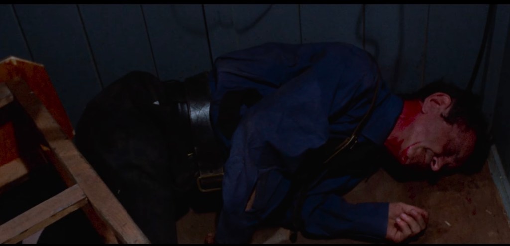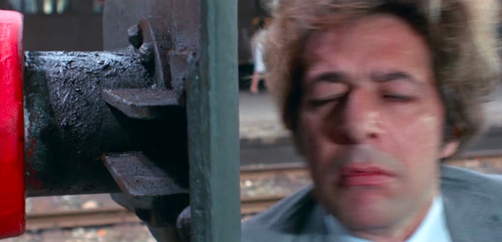 Next, Calabresi (Carlo Alighiero), a doctor at the institute, is seen telling Bianca (Rada Rassimov), his fiancée, that he knows the identity of the person who broke into the institute. Calabresi soon dies a gruesome death when he is pushed into the path of a running train by an unseen person who may be the intruder responsible for the break-in at the institute.