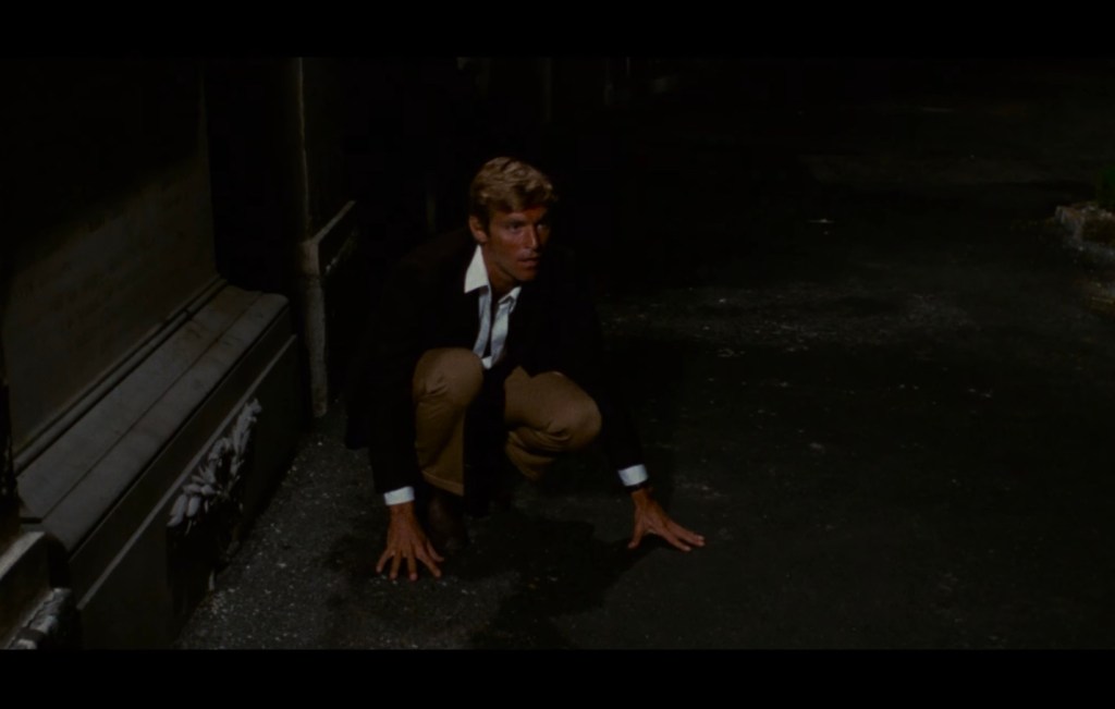 The following day, while taking a walk, Franco bumps into Giordani (James Franciscus), a reporter. In their brief conversation, the polite reporter tells Franco that there has been a break-in at the Terzi Medical Institute, a research center that specializes in gene technology. Giordani proceeds to the institute and learns that an unseen assailant broke into the center the previous night after knocking out one of its security personnel. However, nothing obvious seems to be missing at the institute. Giordani also gets a glimpse of the beautiful Anna (Catherine Spaak), the daughter of Terzi, a rich individual who owns the institute.