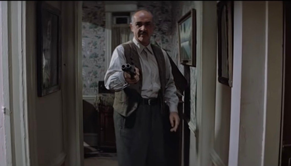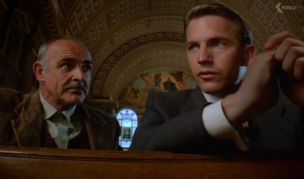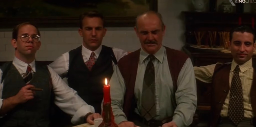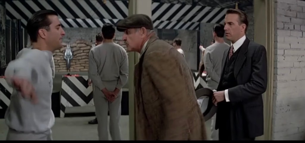After an embarrassing failed attempt to bust a liquor warehouse, Ness meets an old, disillusioned Irish-American policeman, Malone (Sean Connery). Ness is soon impressed with Malone’s insights and integrity to police work. He visits Malone and offers the latter a position in the bureau. Initially reluctant and cynical, Malone first rejects the offer, but then accepts it, realizing that Ness is determined to bring Capone to justice.