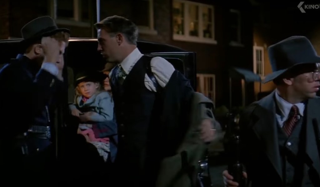Ness takes no chances and places his family in a safe house. Next, he gets wind of a planned liquor smuggling operation near the Canadian border. Coordinating with the Canadian Mountie, Ness’s team inflicts heavy casualties on Capone’s men and seizes their liquor. In addition, Ness’s team gets possession of a ledger that details kickbacks that Capone has received from numerous businesses in Chicago. The team also apprehends one of Capone’s men and pressures him to be a potential witness against Capone.