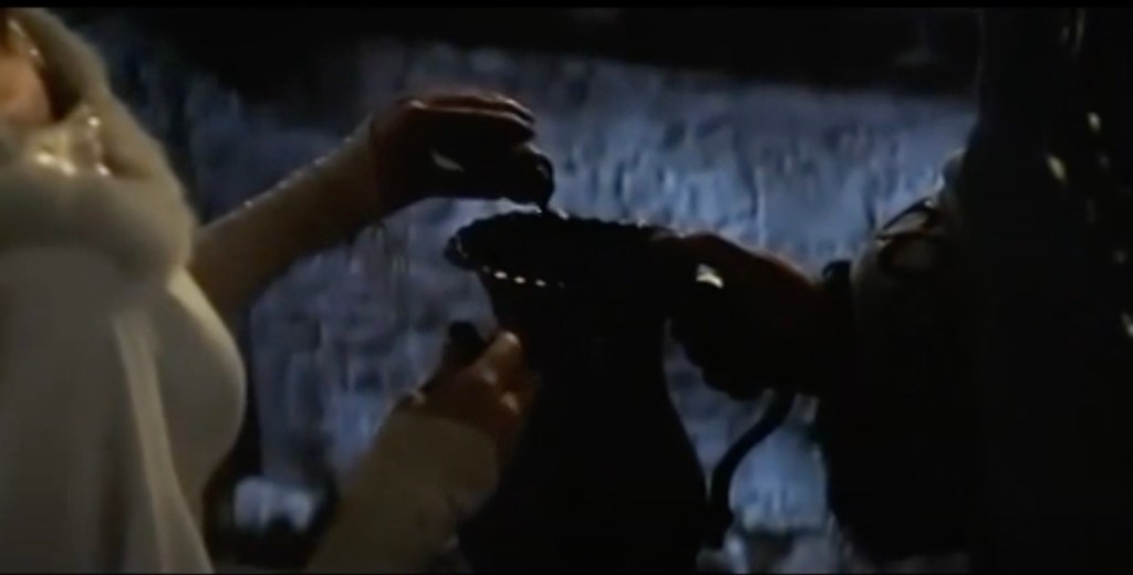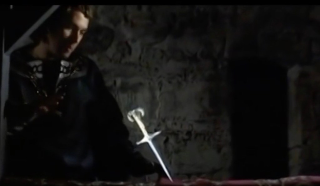 Macbeth sees an illusory dagger appear before him and questions his own sanity. In this case, Polanski stays faithful to the original script. Jon Finch, as Macbeth, performs the soliloquy.