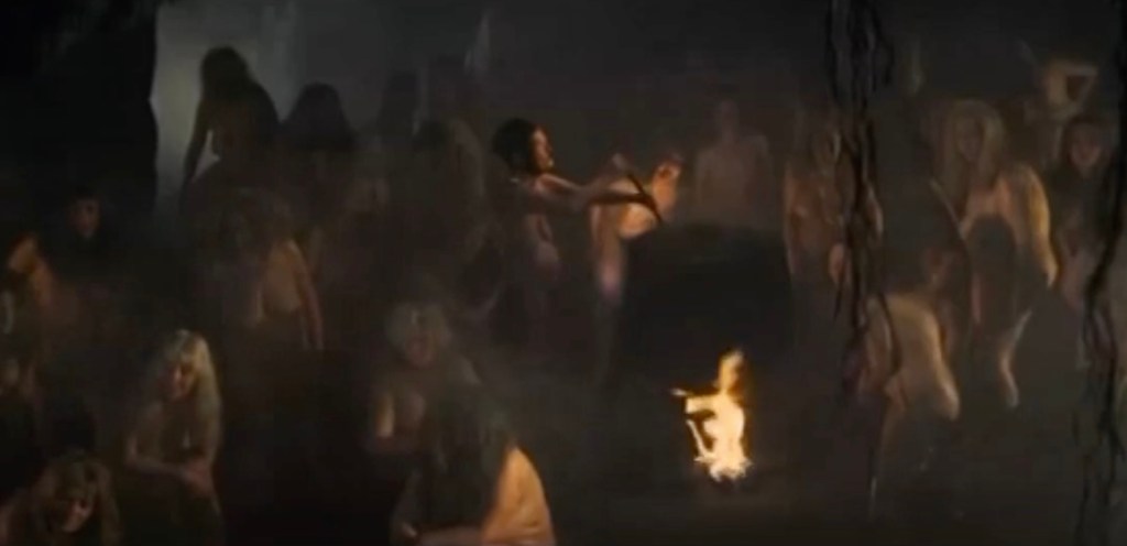 In desperation, Macbeth returns to the place he met the witches and summons them again. They reappear and take him to their lair, where they are performing an eerie ritual.