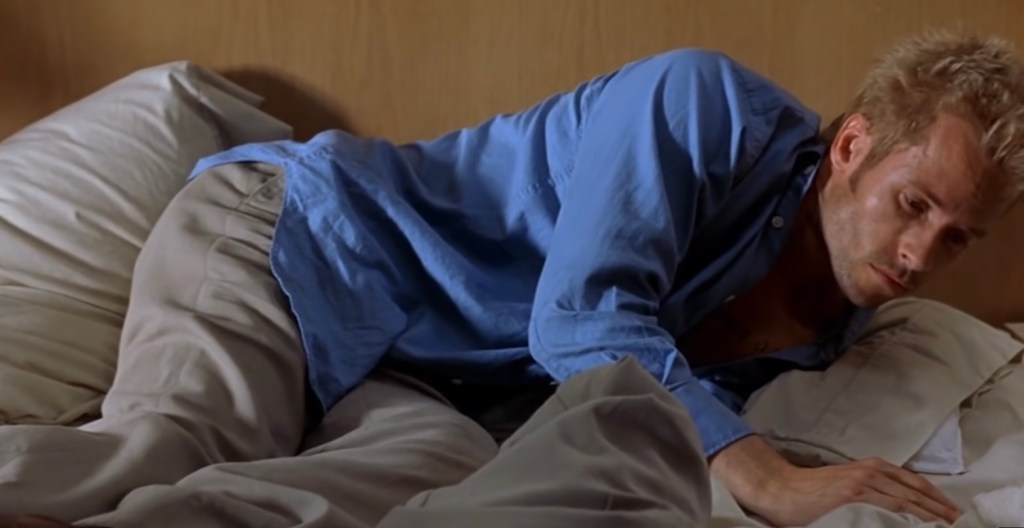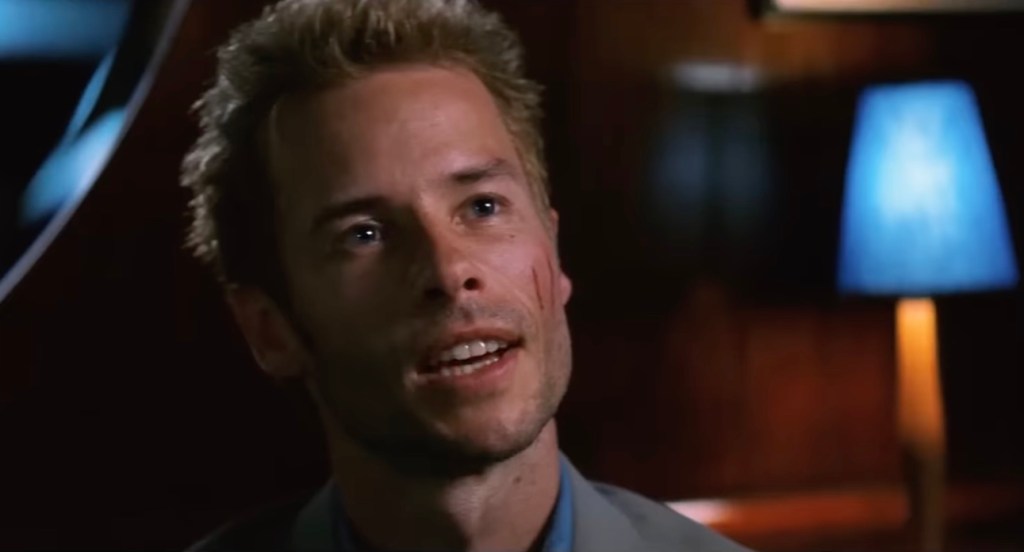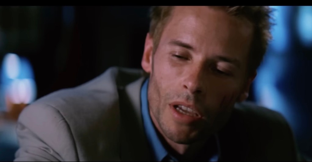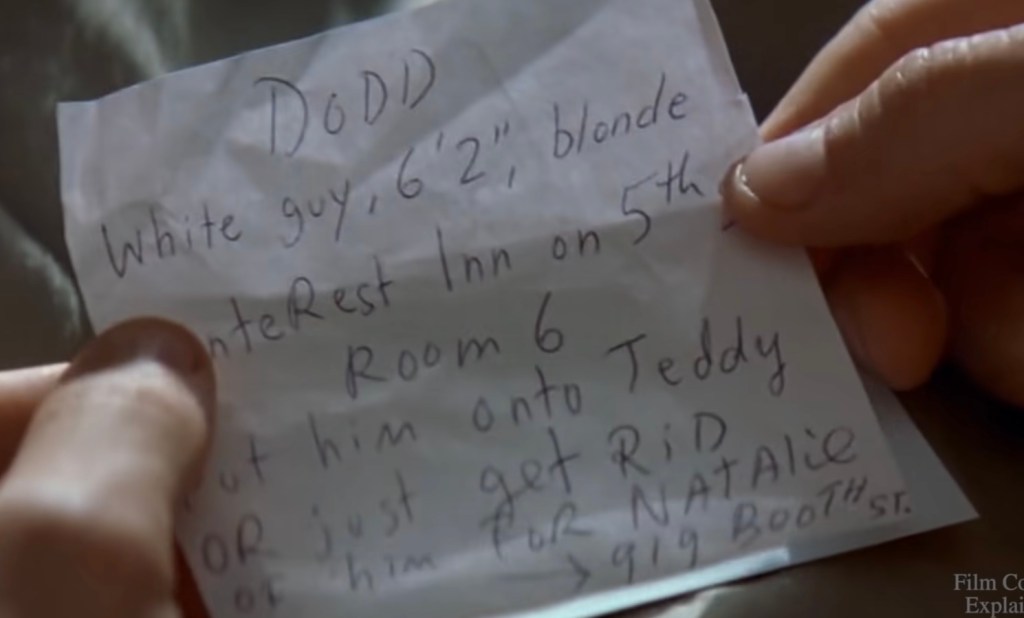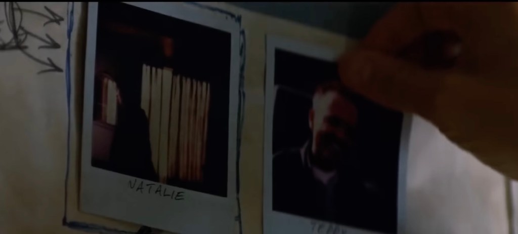 In the color sequences that move in reverse chronological order, it is revealed that the person he just shot was Teddy (Joe Pantoliano), a cop. Leonard has a photograph of Teddy. The note that Leonard has left himself on Teddy’s photo warns him that Teddy is a liar and the murderer of his wife.