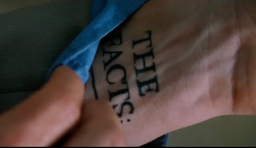 He uses his own body as a giant post-it and tattoos messages to himself to help him piece together his past. Leonard is on a quest to find the person or persons responsible for both his wife’s demise and his present condition. Leonard believes that the person who murdered his wife has the name John G.