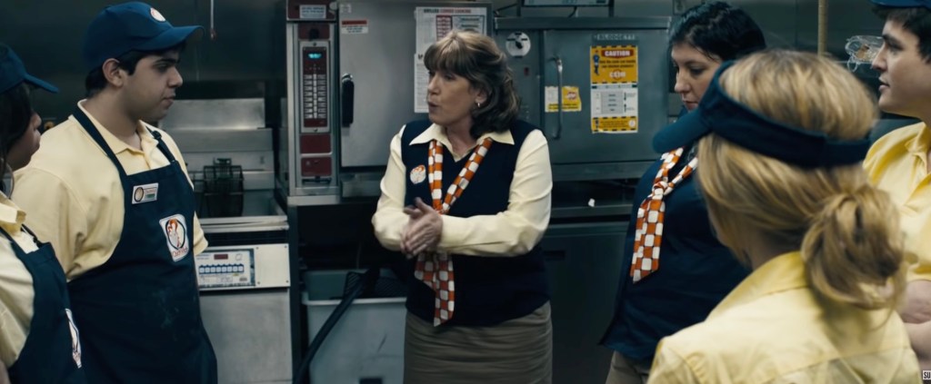 She is preoccupied and irritable and admonishes all her staff to perform better. At this stage, she gets a call from a police officer, Daniels, who claims that he has been in touch with her regional manager about an incident that has just occurred at her restaurant. Daniels proceeds to tell her that Becky (Dreama Walker), an employee at the restaurant, has stolen money from the purse of a patron who visited the restaurant earlier that day. Daniels makes it clear that Sandra should cooperate with him to the best of her ability to ensure that the matter is properly resolved.