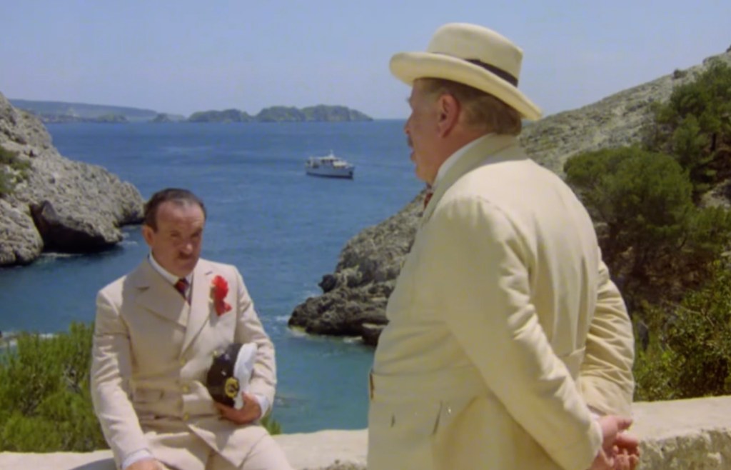 Blatt informs Poirot that Arlena is now vacationing in an exclusive hotel on an island that caters solely to a wealthy clientele. In the novel, it is Burgh Island in England. In the movie, it is an island in the Adriatic Sea. Filming, however, was done at several scenic locales, including Majorca and Sa Dragonera.