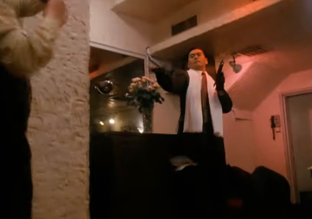 Woo is also known for his sense of style, which is on full display in this movie, with the finely attired protagonists and the way the characters carry themselves. Of course, there are the double-handed pistol firing scenes and quite a few standoffs.