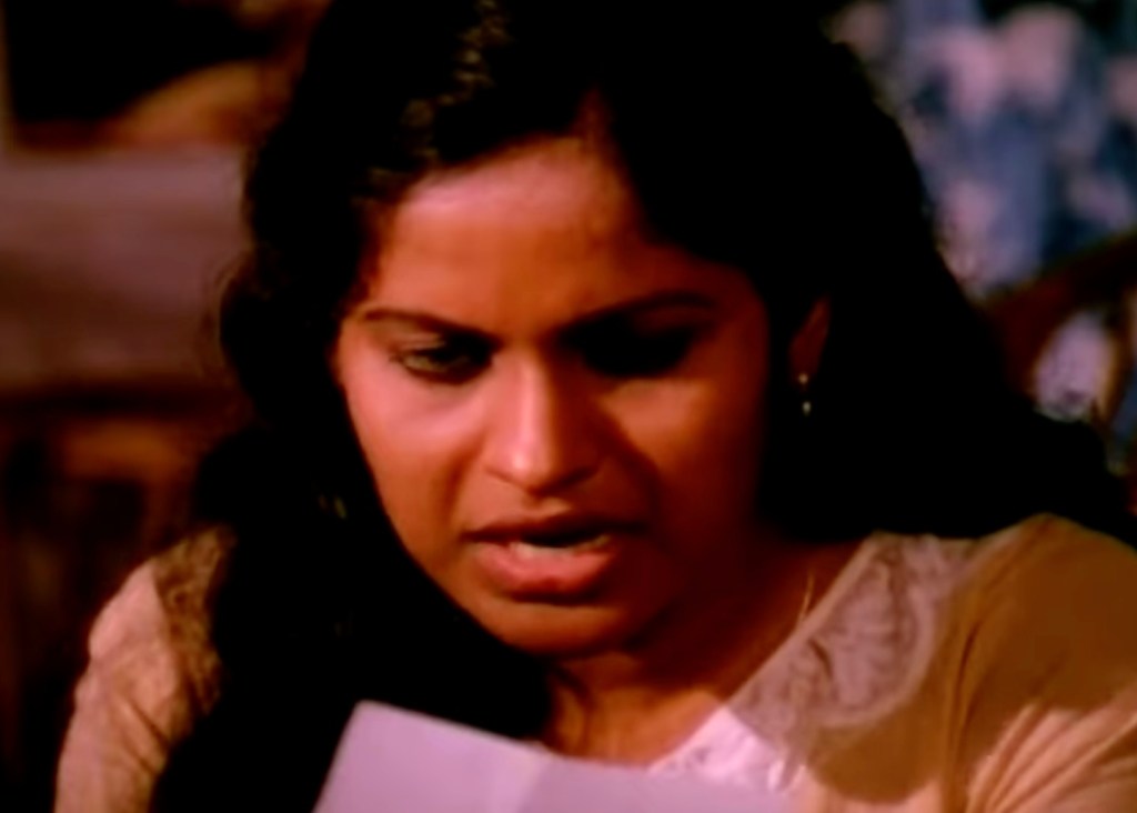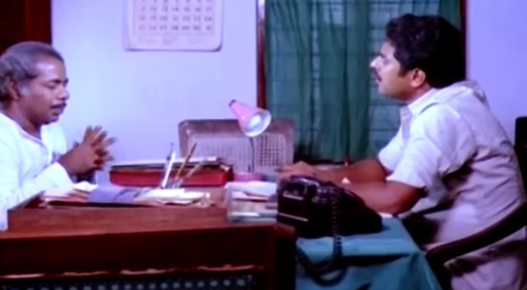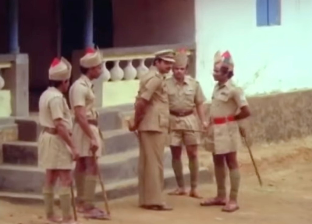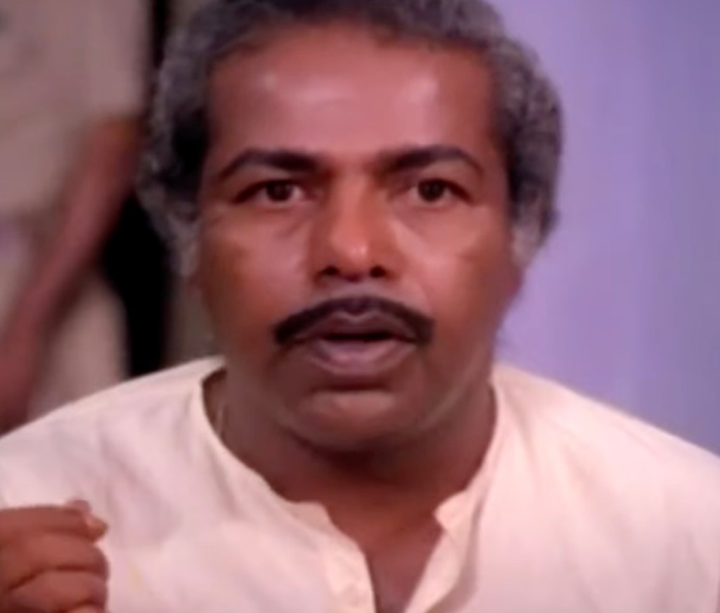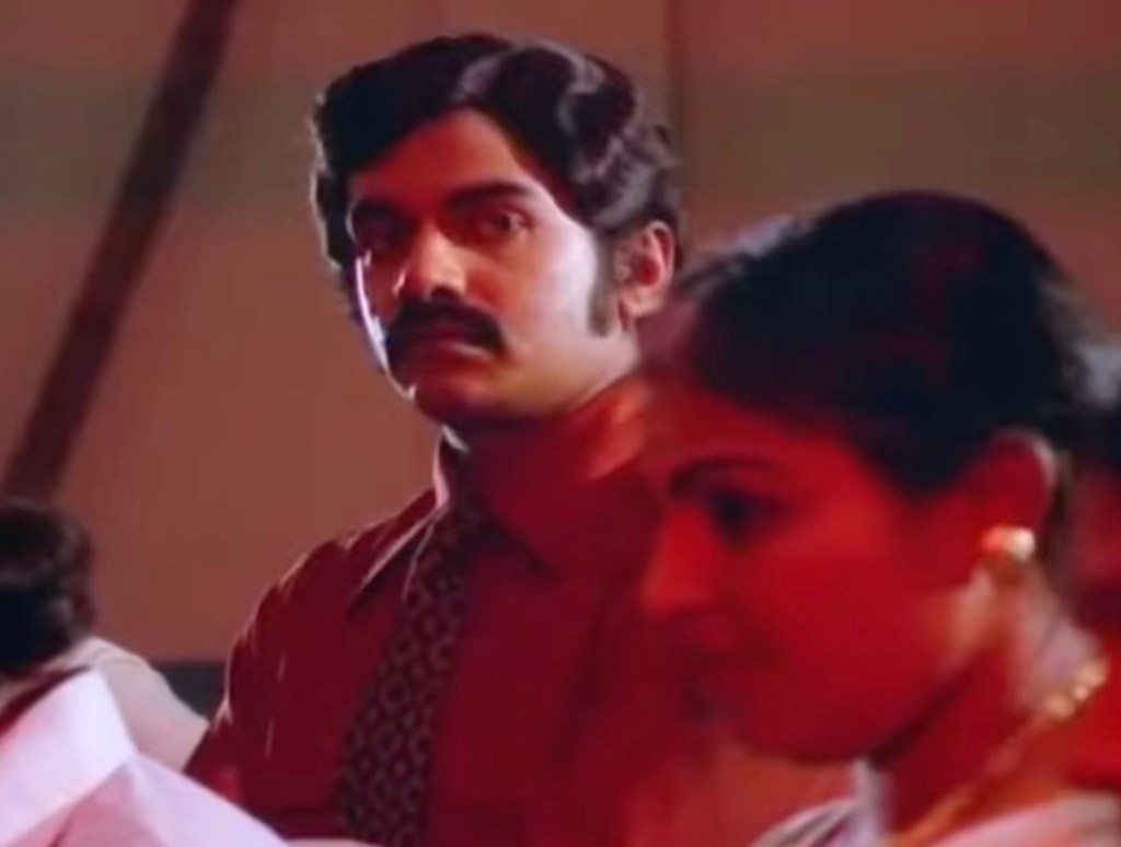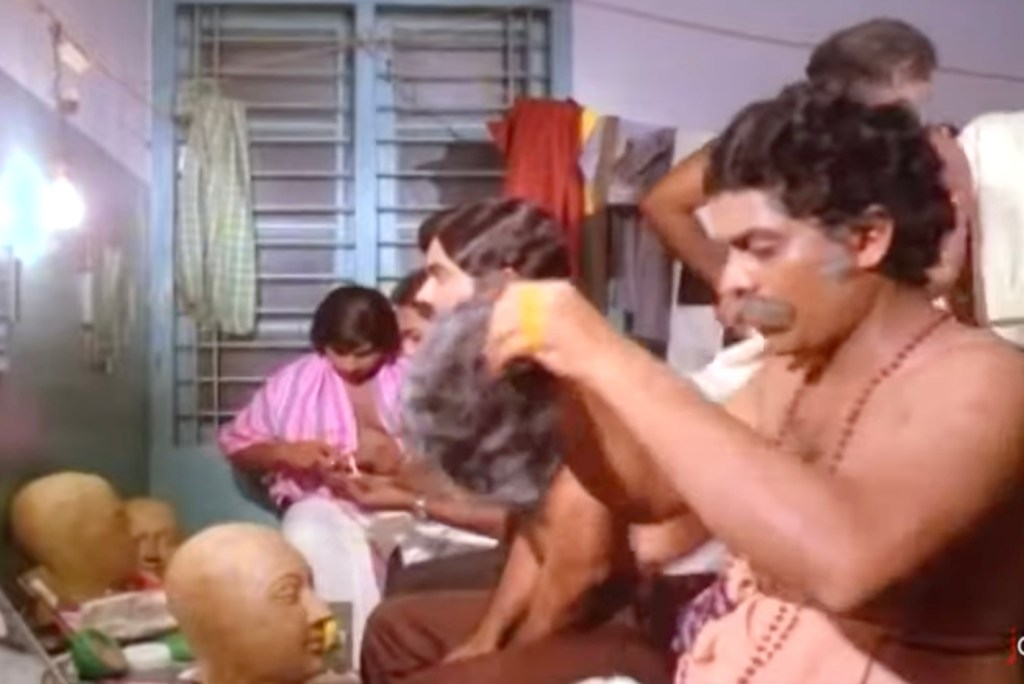 In this post, we will look at Yavanika (“The Curtain”), a classic whodunit from the ’80s. Traditionally, Malayalam movies are not known for big budgets or lavish sets, and Yavanika is no exception to this rule. Most scenes are set indoors in modest homes, a liquor shop, a theater, a police station, and a few outdoor scenes depicting rural surroundings. The indoors are spartan in their decor, as was typical in poorer South Indian homes at that time.