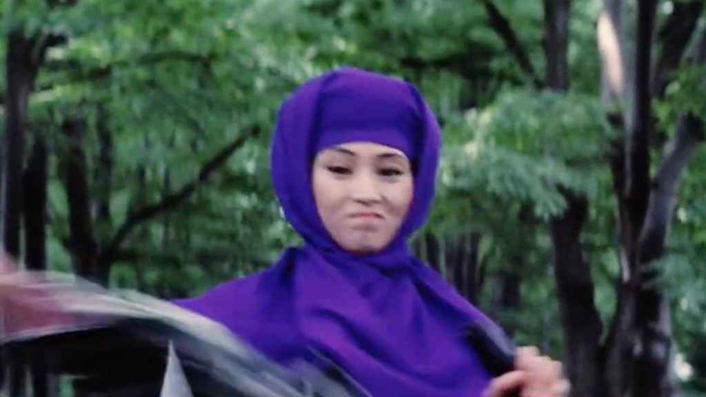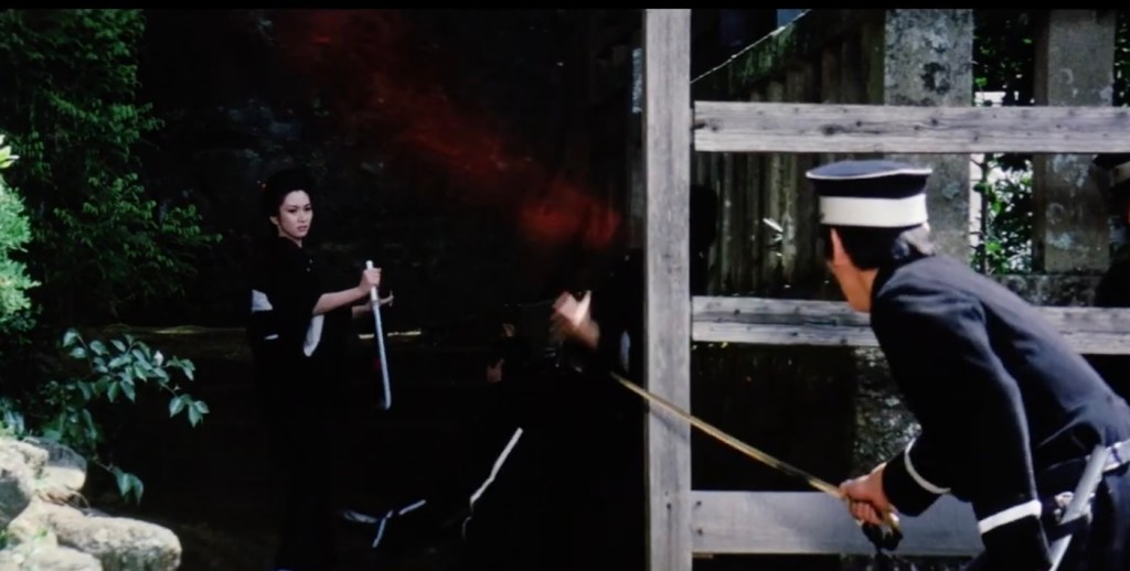Japan’s victorious war against Russia serves as the backdrop for the plot. Yuki is a fugitive from justice, wanted for murder as a consequence of her personal quest for revenge, as seen in the earlier movie. She has a trusted male friend and guardian angel (Yoshio Harada) who assists her, though how she became acquainted with him is not elaborated in the movie’s plot. After two action-packed confrontations with the law, she is apprehended and sentenced to death.