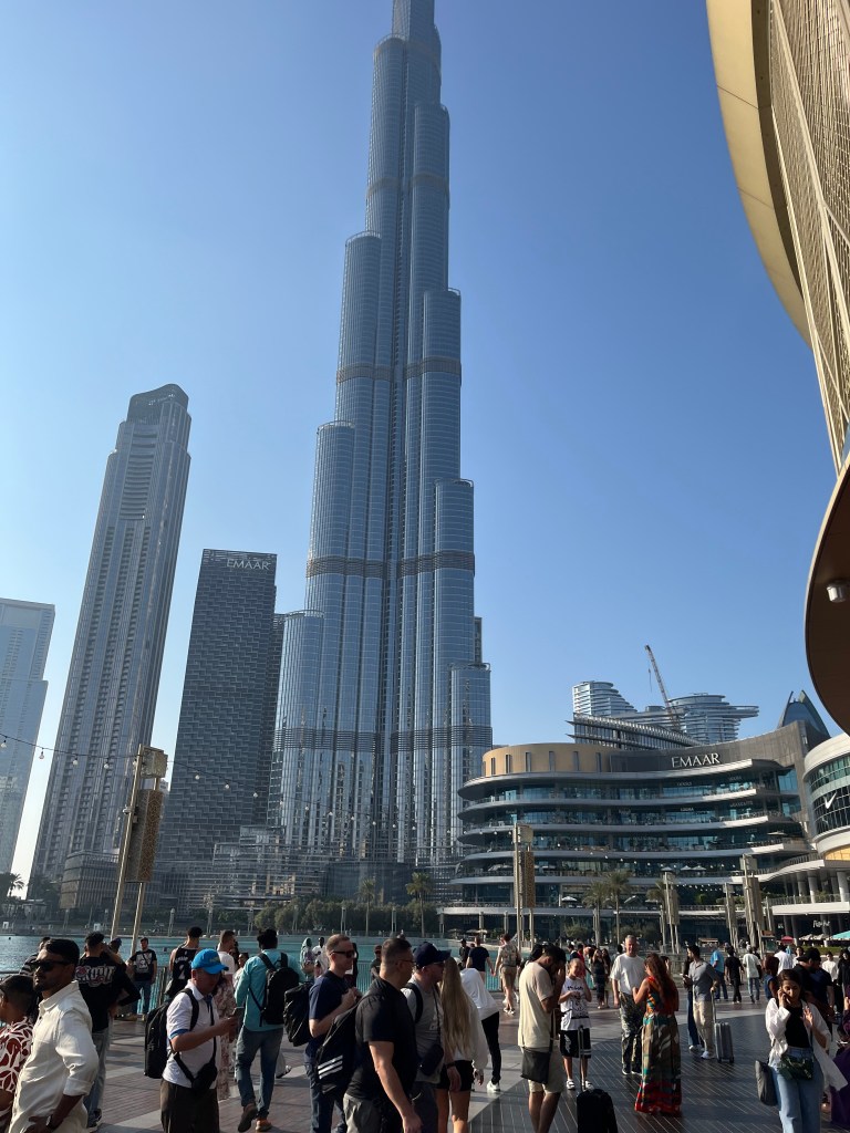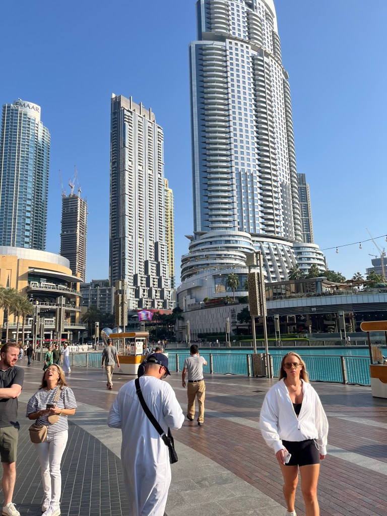 The waterfront mentioned above is the Burj Khalifa Lake, the site of the Dubai Fountain. A fountain show is scheduled for either 1:00 PM or 1:30 PM on weekdays, and every half hour from 6:00 PM to 11:00 PM.