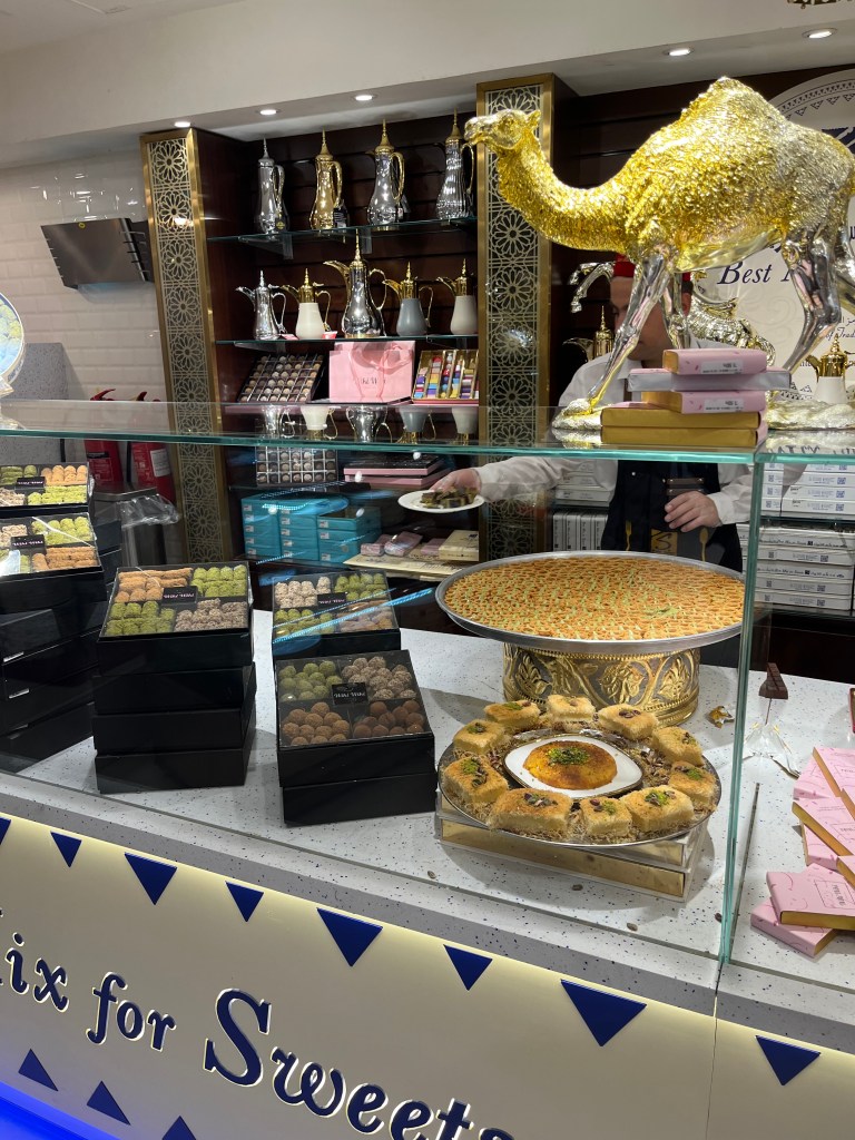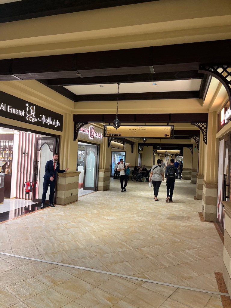 Souk Al Bahar, an extension of the Dubai Mall, is a mini Arab-style souk or marketplace that features antique stores, carpets, and a chocolate shop where we stopped, sampled, and then bought Dubai Chocolate. The complex also has a restaurant, which was where we had lunch for the day.
